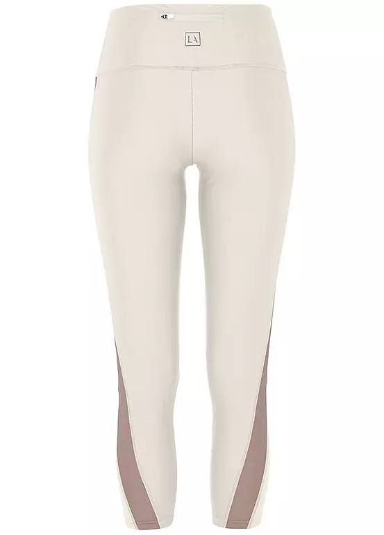 Cropped length athleisure leggings featuring contrasting coloured inserts and mesh inserts. A wide elasticated waistband adds comfort, and they are crafted from a breathable material with stretch content. Contrasting side stripes. Zipped pocket on the back.