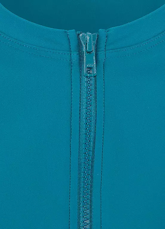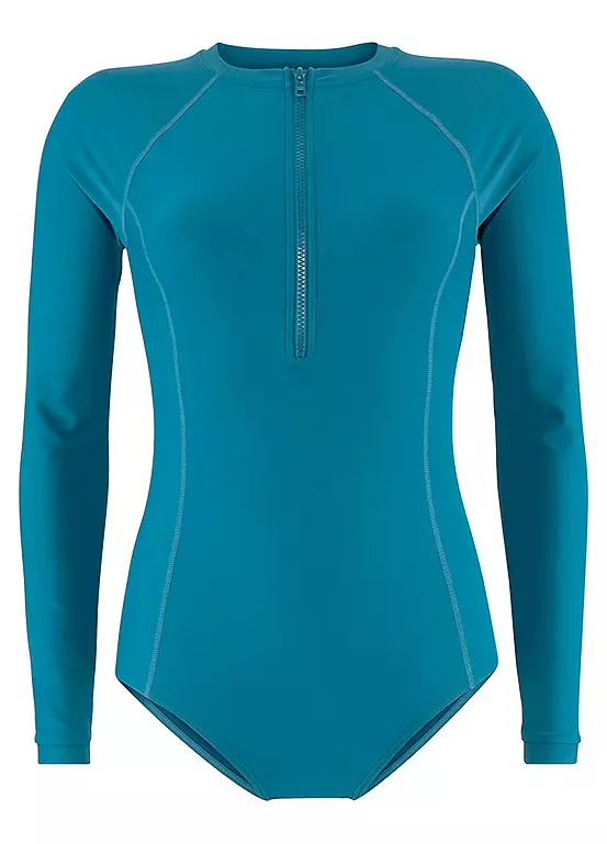 Perfect for water sports, this long sleeve swimsuit protects your skin from too much sun when kayaking, surfing, white-water rafting or stand-up paddling. The zipper helps you put on and take off the surfsuit more comfortably while seams at the sleeve ends, shoulders and along the middle of your body ensure an optimal fit. The soft material is also very stretchy. Zip front.