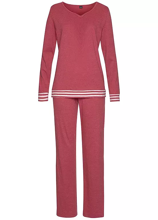 Long sleeve pyjamas crafted from a soft cotton blend in marl effect colours with stripe details. The rounded neckline top reveals trendy striped cuffs and hem. The matching long bottoms come with side pockets and striped tunnel drawstring.