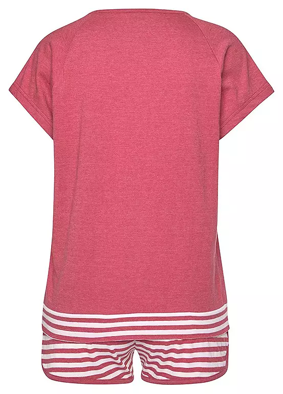 Shorty pyjamas crafted from a soft cotton blend in marl effect colours with stripe details. The round neckline top reveals a trendy stripe hem with raglan sleeves. The cute stripe shorts comes with a tunnel drawstring for comfortable fit.