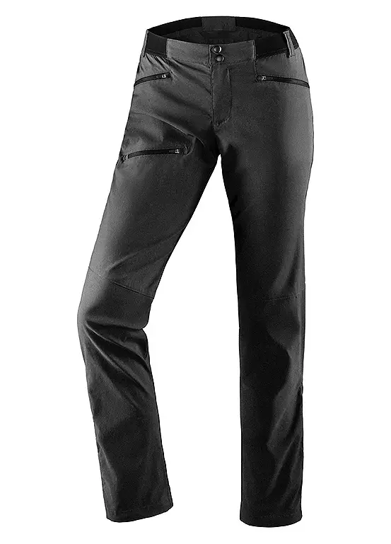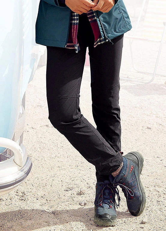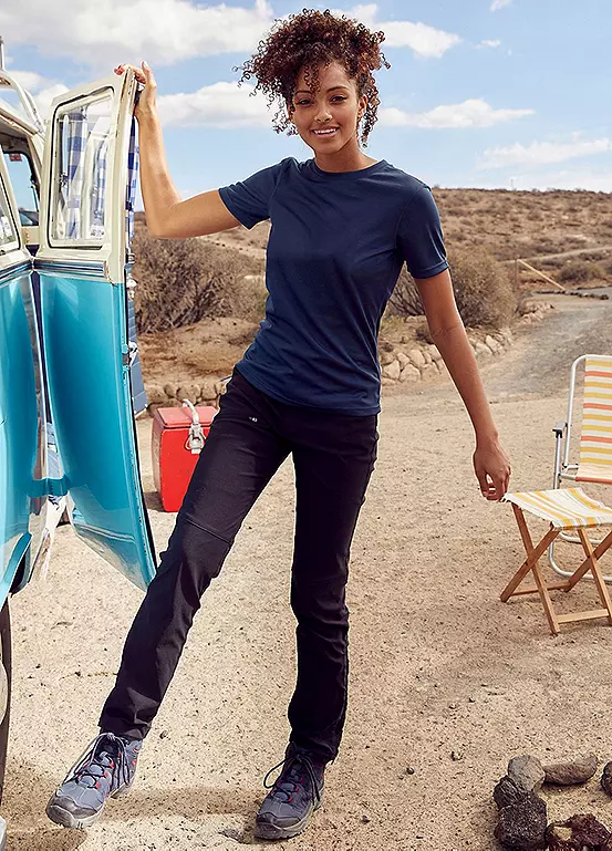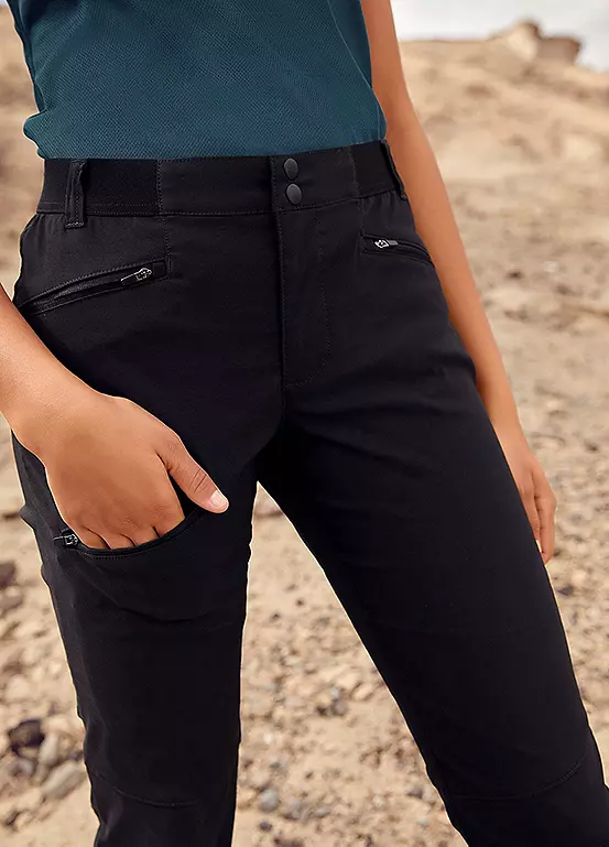 Sporty, stretchy hiking trousers with a comfortable elasticated waistband with button closure and four zipped pockets for plenty of storage space. The hem width can be extended with a zip and the look is complete with a drawstring at the hem and breathable stretch fabric.
