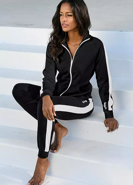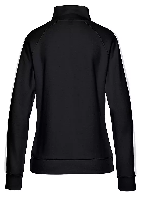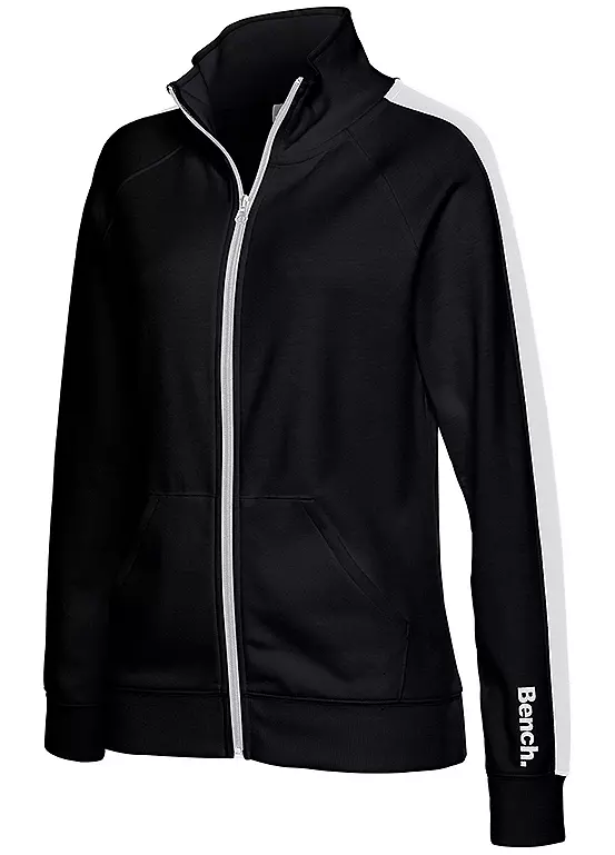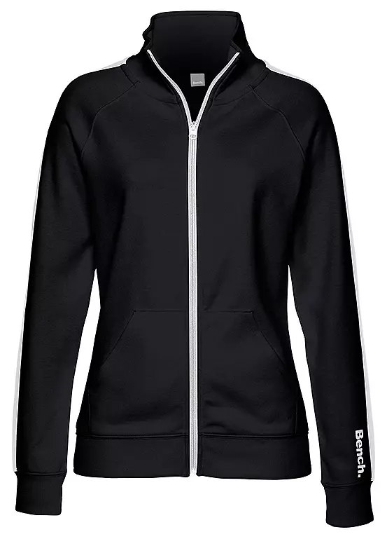 This fashionable jacket is styled with a zipper, side kangaroo pockets and a high collar that protects you from wind and harsh weather. It also features an elastic interlock jersey which makes it even more comfortable to wear. The design is highlighted by a colour-contrasting stripe that runs along the shoulders and raglan sleeves, finished with a discreet logo print at the forearm.