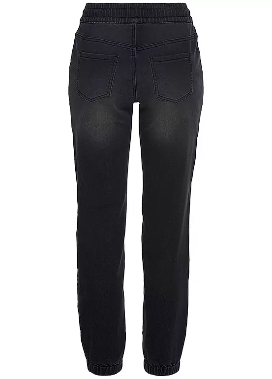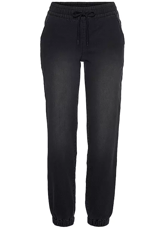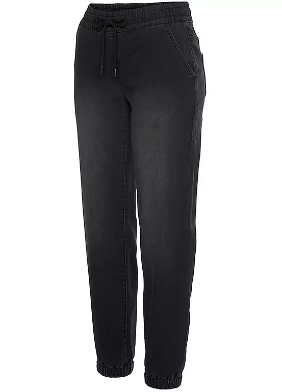 Comfortable like jogging pants and casual like denim, these slip-on pants are in a denim look. Even the washing effects look super authentic and cool. In addition, the jogging pants have an elastic drawstring waistband and elastic leg cuffs. Elastic waistband with drawstring. Soft elastic material.