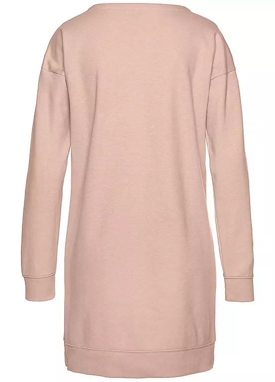 This lounge dress made from a stretch interlock jersey fabric is particularly eye-catching due to its sporty look and special cut. Side dividing seams run diagonally while the small pockets allow you to comfortably hide your hands, and the obliquely printed logo is anything but classic. The design is rounded off by the short length, a round neckline and ribbed cuffs on the sleeves and hem.
