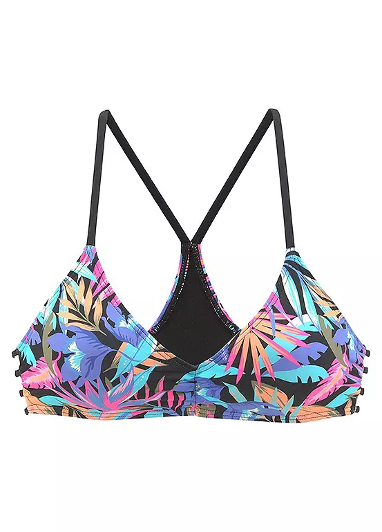 A hip racerback is incorporated into the dynamic top with the colourful tropical print. The front and back of the bikini top are connected by narrow, contrasting straps. Removable soft cups. Soft microfiber. Cup C/D. Machine washable. 85% Polyamide, 15% Elastane. Lining: 100% Polyester.