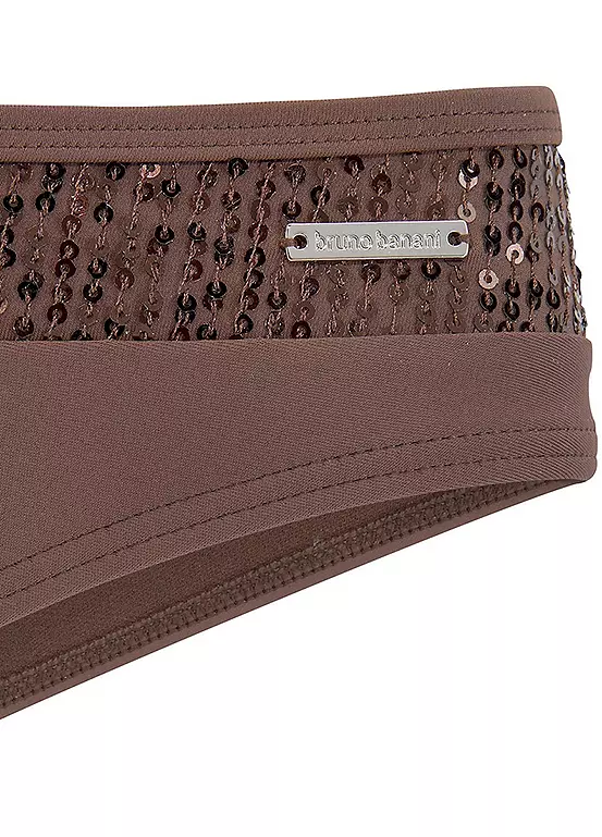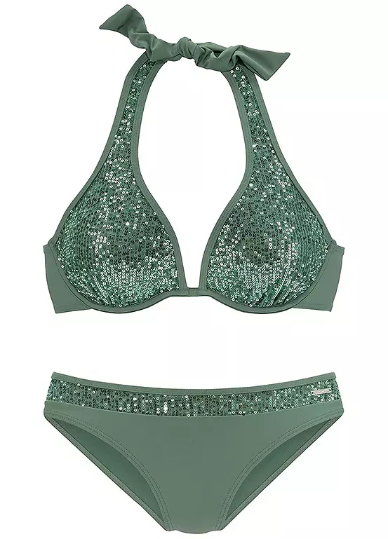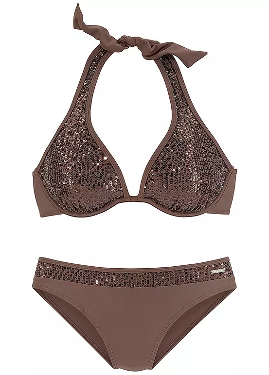 Elegant underwired bikini by Bruno Banani with sparkling sequins and removable soft cups. Great for the beach, itโs made from quick-drying stretch material. The top features a back fastening and ties at the neck, while the matching bottoms come in a classic cut. Shiny look with sequins. Removable soft cups. Hand wash. 80% Polyamide, 20% Elastane (Lycraยฎ Xtra Lifeโข). Lining: 100% Polyester.