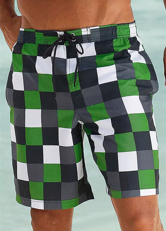 Super cool swimming shorts featuring an awesome bold checked print. Featuring an elastic waistband with a drawstring and two front pockets. A stylish choice for the beach or lounging by the pool.