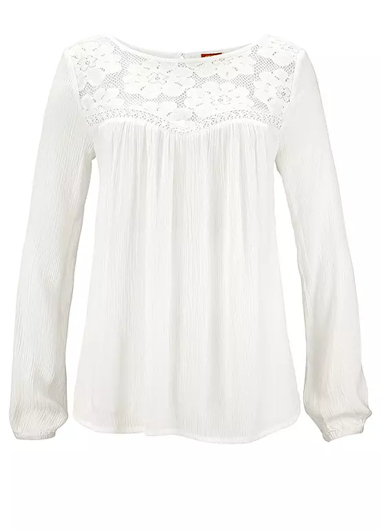 This on trend top in a ruched crepรฉ fabric will soon become a firm favourite. With embroidered lace detailing, a slightly flared hem and elasticated long sleeves, itโs a great choice for any season. Length approx. 62 cm (24ยพ ins).
