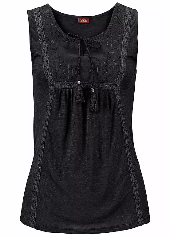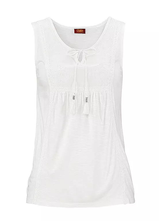 Look flawless as you cover up on the beach this summer! This crisp top boasts gorgeous ribbon tie detail, as well as small tassels at the neckline. Length approx. 64 cm (25 in).