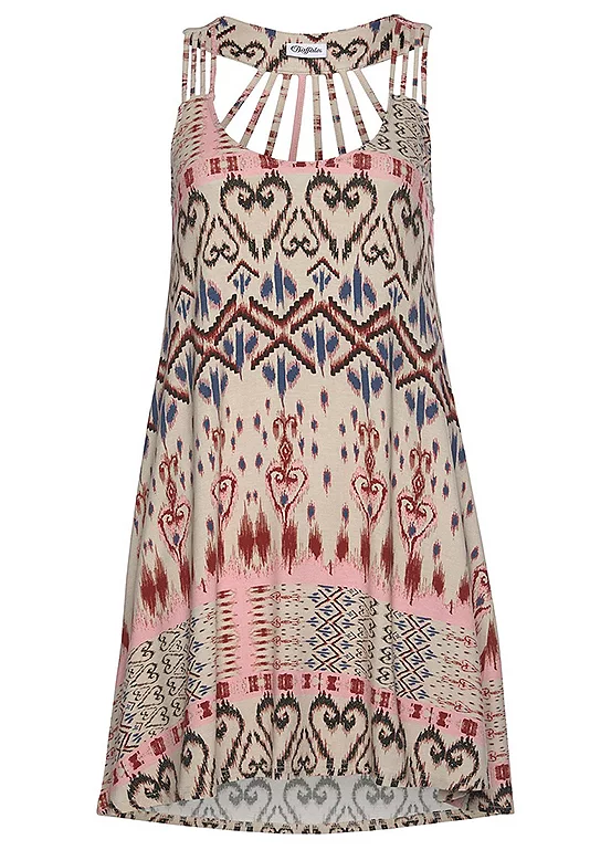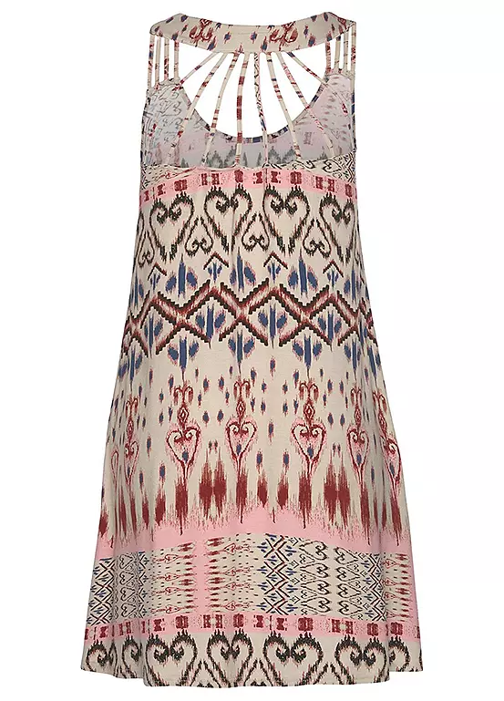 This attractive beach dress has a wide round neckline, while the back features special straps for a unique design. The special printed design is unique on every garment. Easy to combine. Wide round neckline Strap detail on the back All-over print
