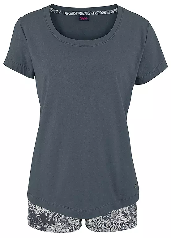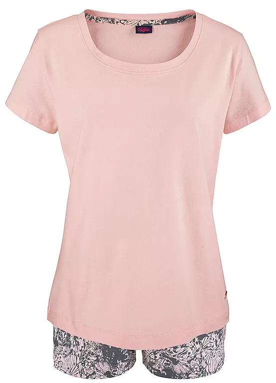 Cute PJs in a lovely short design with a plain, short sleeve top featuring a rounded neckline. The patterned shorts are styled with a colour contrast elasticated waistband. All in a lovely single jersey fabric for added comfort.