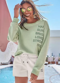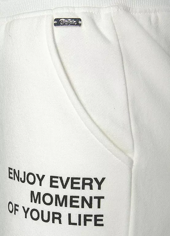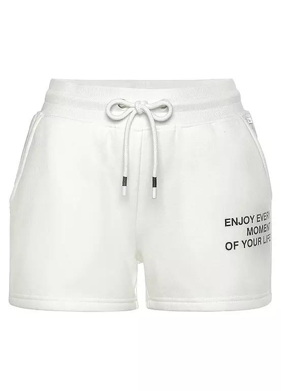Soft cotton blend sweat shorts finished with an elasticated waistband and a drawstring tie, while a stylish slogan print completes the look.