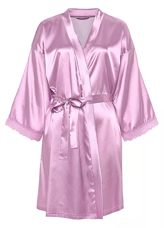 The fine lace inserts and the shiny satin quality make this kimono style dressing gown a must-have in terms of looks alone. It’s in a comfortable fit with wide three-quarter length sleeves, with lace trim and a loose belt at the waist. With wide 3/4 sleeves and a loose belt at the waist. Shiny satin quality.