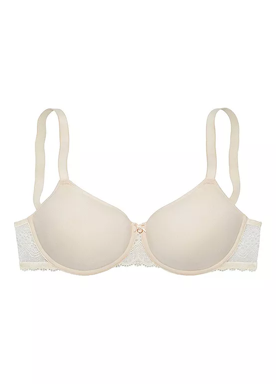 This fashionable bra combines maximum comfort with a perfect fit and beautiful lace. The seamlessly preformed soft cups are worked on underwire and model a beautiful breast shape to make it look a little smaller. Thanks to the flat and soft edges and the softly lined underwire, it guarantees maximum comfort without pinching. The smooth cups allow this bra to blend in under tight-fitting clothing while the back and the middle are made of delicate lace with a graphic look. A small decorative bow crowns the design in the middle of the front for a romantic touch. The straps and the back closure are individually adjustable. Optically reduces the bust by one size and gives it a nice shape. With integrated underwires for a secure hold. Individually adjustable straps and back closure.
