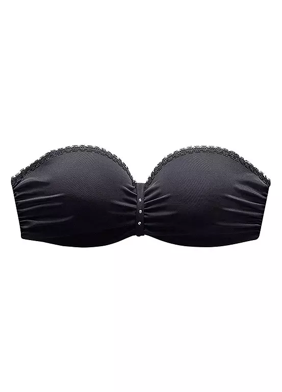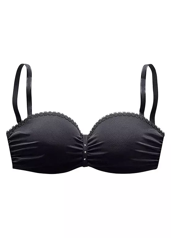 A great all-rounder with adjustable straps and removable pads for a push-up effect. Offers different options for wear: strapless, or in standard arrangement as halterneck or with transparent straps (1 pair included). With gathers at side of cups and at front centre, embellished with rhinestones, and adjustable straps and rear fastener. Made from a comfortable microtouch fabric