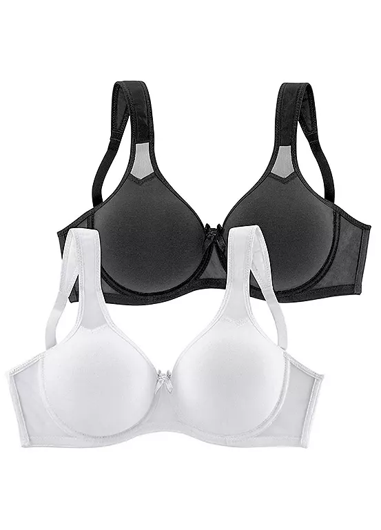 A two pack of pretty and practical t-shirt bras featuring soft cups and elegant mesh inserts on the straps and below the cups. A classic look with an added touch of class and sophistication.