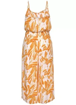 Jumpsuit overall with all-over print, adjustable spaghetti straps, V-neckline and elasticated waist. These culotte-style trousers feature side pockets and are suitable for warm days. V-neck. Adjustable spaghetti straps.