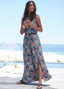 Maxi dress in a sleeveless design with button closure at the neck and a polka dot print.