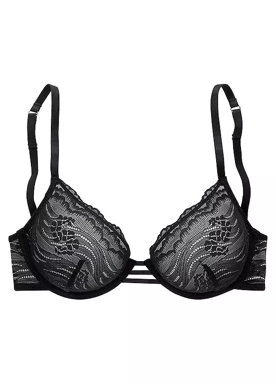 Feel glamorous in this feminine underwired bra with a fine ribbon look in the centre front. The cups are made of subtly transparent floral lace and have individually adjustable straps and back closure. This is the perfect bra for those special occasions! Shop now! Feminine underwired bra with a fine ribbon look in the centre front. Cups made of subtly transparent, floral lace.