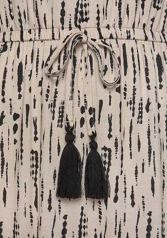 Playful dress with all-over print and a deep V-neckline. The wide straps are connected to an insert at the back and are tailored with elastic, detailed with cord and tassels. The skirt is slightly flared. V-neckline. Wide straps. Flared skirt.