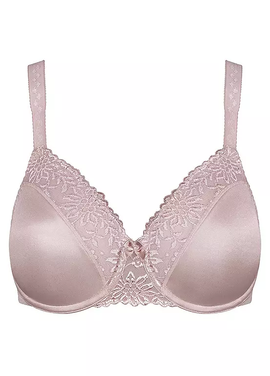 Elegant minimiser underwired bra featuring beautiful embroidered lace with soft straps and seamless pre-formed cups. Designed to make the bust look a cup size smaller.