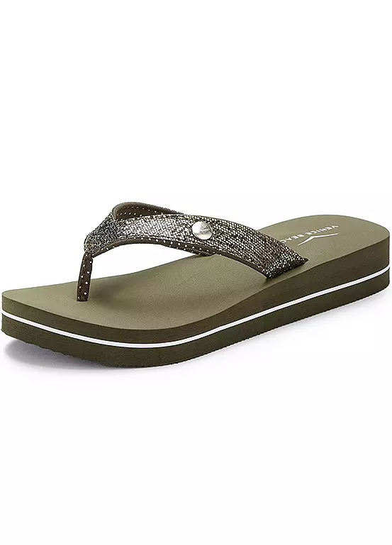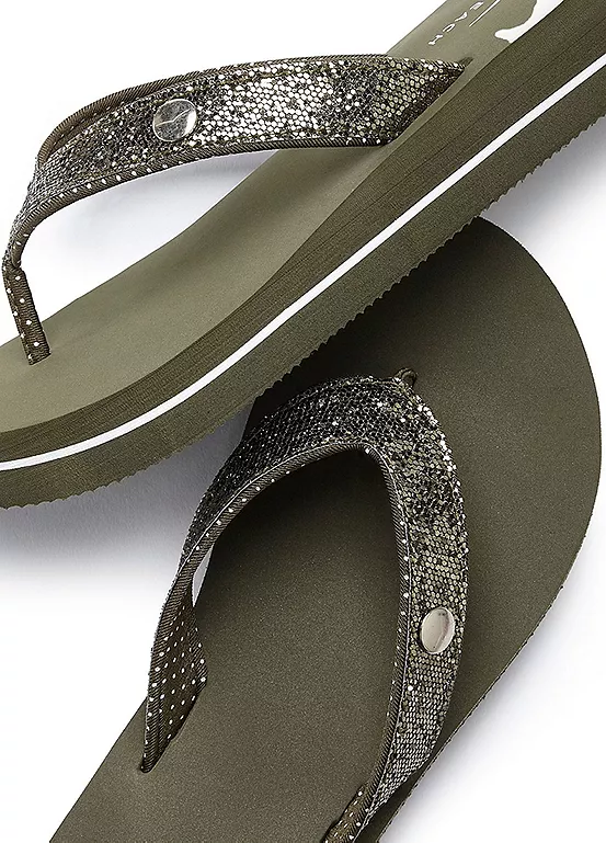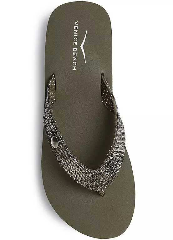 Glittery flip flops made with ultra light material. Heel height approx. 3 cm.