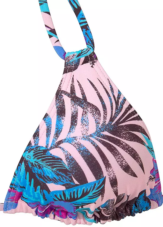 Classic triangle bikini top for your mix and match collection, featuring a striking tropical print and straps that tie around the neck. Made from soft microfibre material.