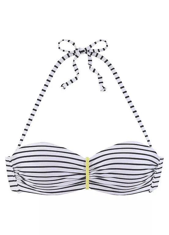 In a striped design and braided contrast detail, the padded cups on this bikini top conjure up a great dรฉcolletรฉ, and the boning on the side provides the necessary support. You can remove the straps if necessary or tie them in the neck. A perfect mix and match piece. Braided contrast details. Removable cups for cup A and B. Side boning.