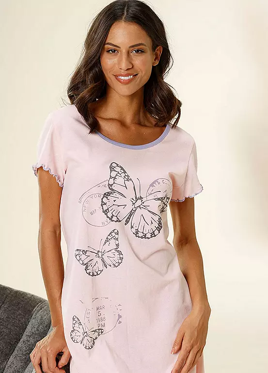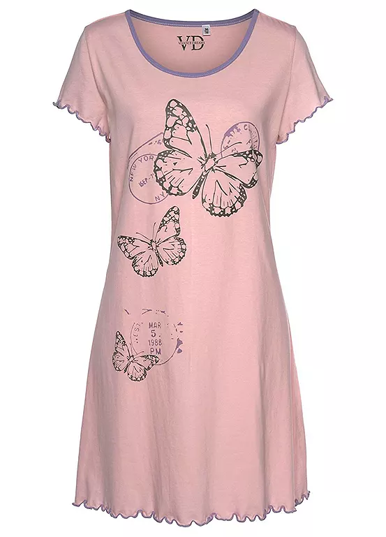 Nightie with a wonderful butterfly print at the centre of the design. There is also a great rolled hem at the ends, short sleeves and a sporty round neckline with piping in a contrasting colour.