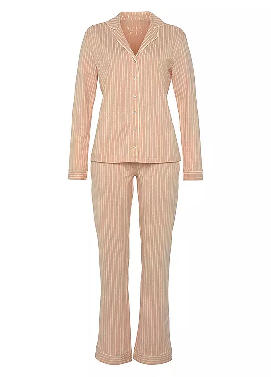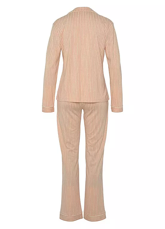 A cosy cotton mix pyjama set featuring a top with long sleeves and front button fastening as well as matching bottoms with a drawstring waistband and side pockets.