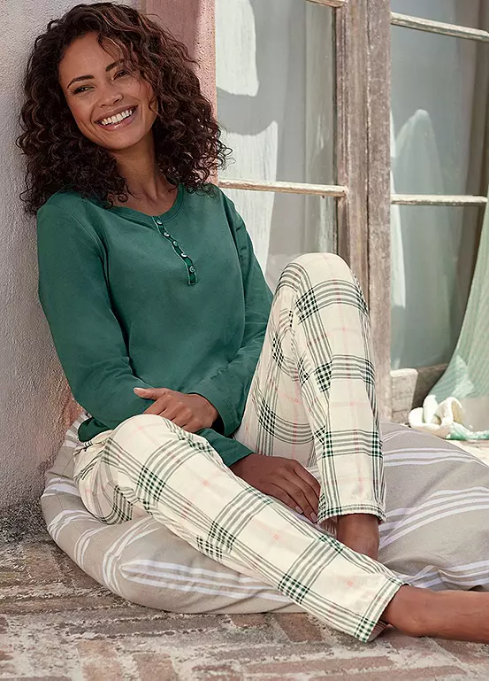 Cotton mix pyjama top with long sleeves and a button placket at the neckline.