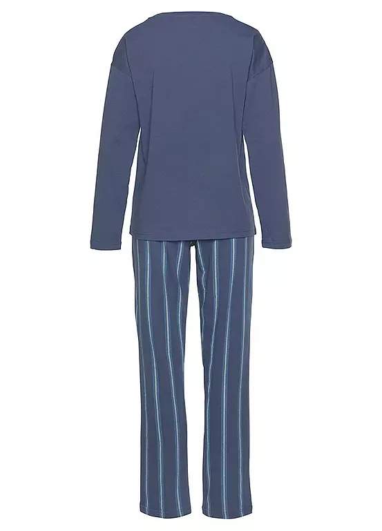 Cute pyjamas by Vivance Dreams. They consist of a long sleeve top with wording printed on the front and stripe trousers with an elasticated drawstring waist. Long sleeve top with a round neckline and front print. Stripe long trousers with an elastic drawstring waistband.