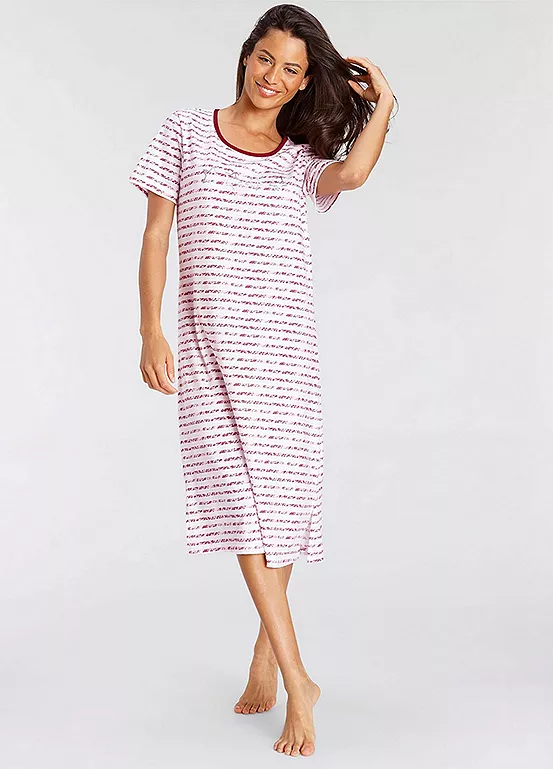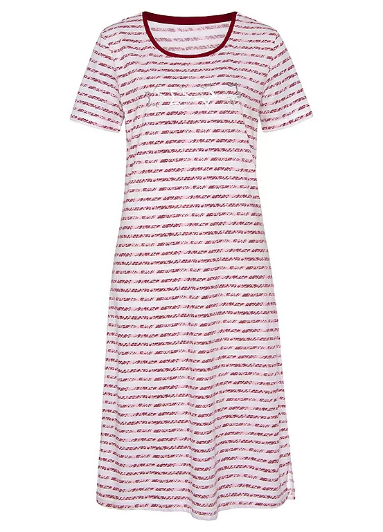 A midi length nightdress with stripe design and foil print at the front, itโs perfect for a night of sweet dreams! With short sleeves and a round neckline, itโll keep you comfy and stylish all night. Side slits at the hem for extra flair and made of pure cotton to keep you cosy. Sweet dreams guaranteed! Midi length nightdress with stripe design and foil print at the front. With short sleeves and a round neckline. Soft single jersey made of cotton.