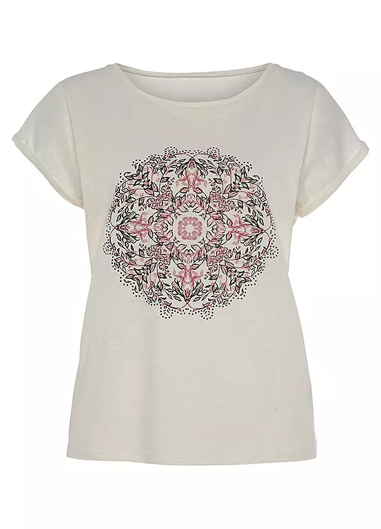 Casual and modern t-shirt with a beautiful front print and a wide round neckline. Wear with a cool denim jacket and fitted pants for a city look, or just with shorts and sandals for a summer beach vibe.