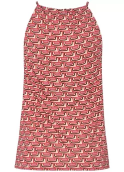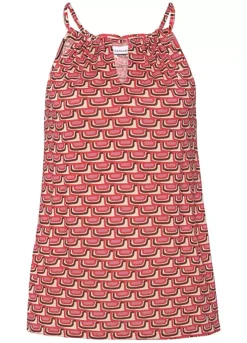 Summery cami top with an all-over pattern print in a retro design. Finished with a round neckline with gathering, cut-out detail and spaghetti straps. Neckline with a small slit. Fashionable shape.