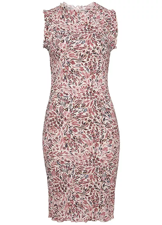This stylish dress by Vivance features a high neckline, ruffled edges and baby lock hems. It’s in a close fit and crafted from woven fabric in a crepe look. High neckline. With ruffle edges. Baby lock hems.