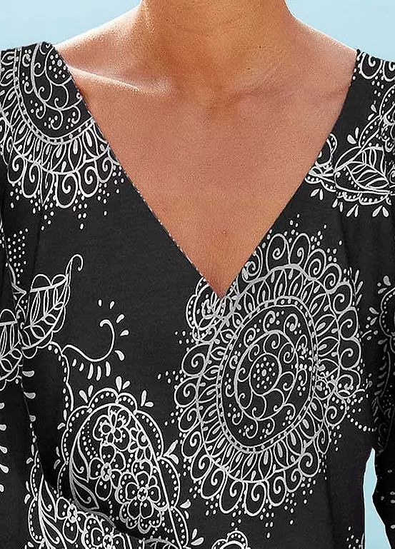 Beach shirt by Vivance with an all-over paisley pattern. Deep V-neckline, wide sleeves. Comfortable, relaxed fit. Can be combined in many ways. Soft quality made of viscose. Deep V-neckline. Quarter Sleeve.