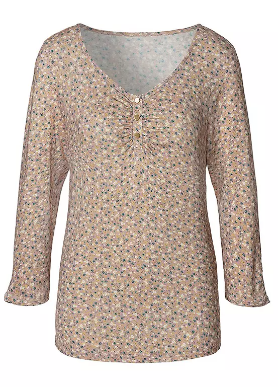 A fashionable three-quarter sleeve top with a short, shiny button placket and delicate ruffles on the round neckline. In a straight cut, this versatile piece is perfect combined with narrow leg trousers or leggings. Floral print. Three-quarter sleeves.