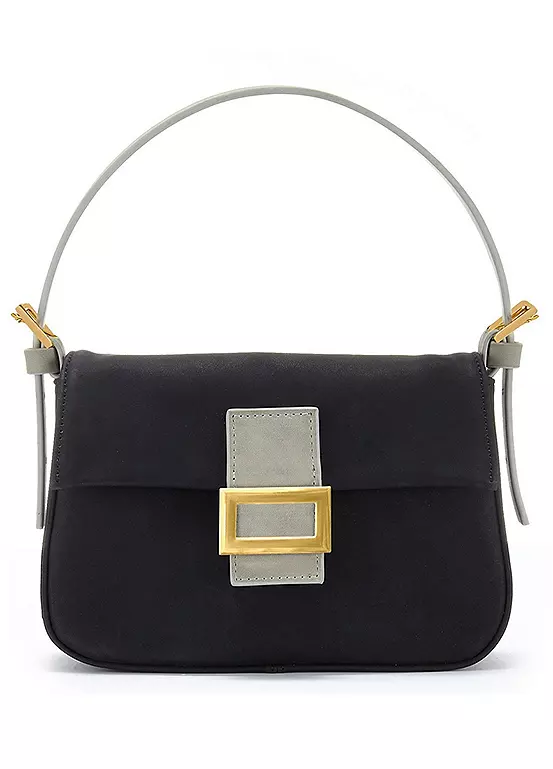 Adorable mini handbag made of vegan faux leather. Finished with contrasting metallic details. Dimensions approx. 13H x 19W x 5D cm.